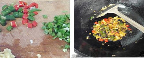 7油锅里倒入油,待5成热时,放入蒜末。青红辣椒、姜末小火爆香。
