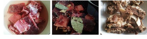 1、超市买的盒装牛排骨,回家后用清水浸泡一会,冲洗几道;冷水下锅,放料酒、香叶、桂皮、干花椒粒、八角等香料,水烧开后,再煮两三分钟,捞出,在流动的温水中冲去浮沫;