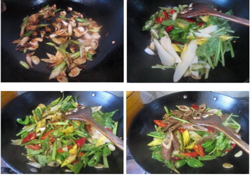 配料:青红辣椒,冬笋,胡萝卜,洋葱,姜蒜,白糖,少许白酒和鸡精