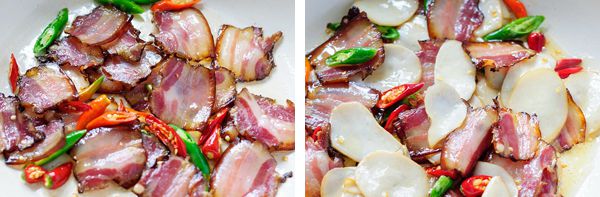 5、倒入切好的腊肉片,大火翻炒至腊肉微蜷曲、油脂部分透明。