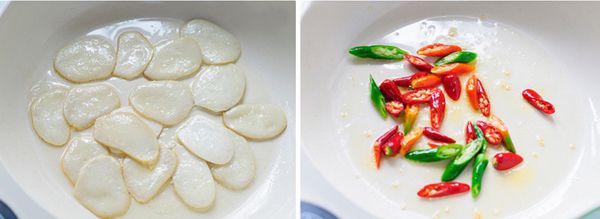 2、杏鲍菇洗净后斜切成厚片,尖椒洗净切成小段。
