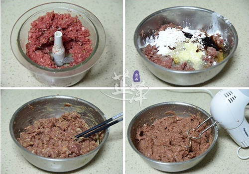 3.搅打牛肉糁时,一定要顺一个方向,否则牛肉馅难以形成胶状。