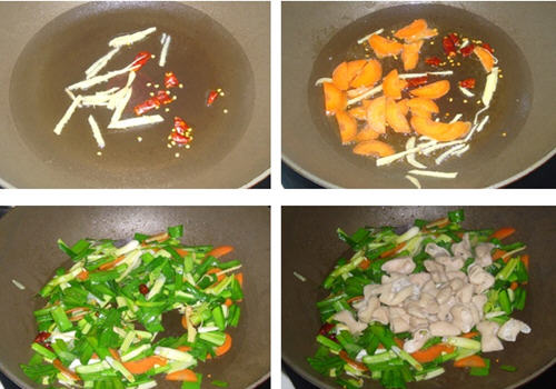 3.炒锅烧热加适量色拉油,爆香姜丝、干红椒,胡萝卜片放入炒透。