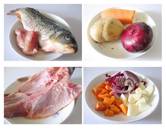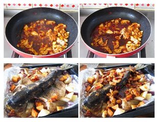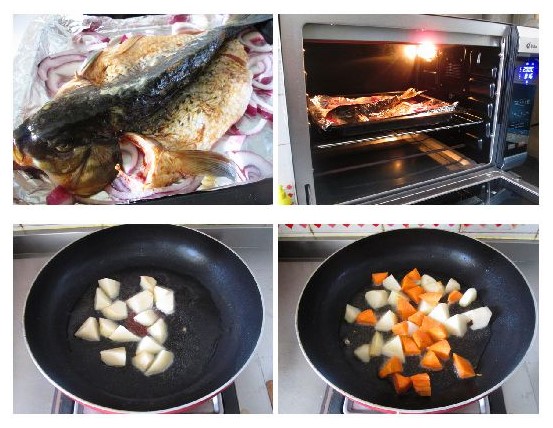 15、烘烤时间到了,将鱼取出,加入煎炸好的土豆和胡萝卜块