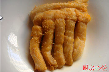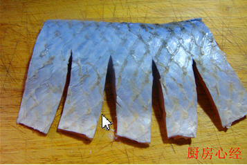8、炸之前,鱼身轻轻的掸上一层薄面粉,肚档成熟之后的形状好看。