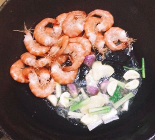 2、 锅烧热后,倒入腌制好的鲜虾翻炒,炒干水份后起锅。