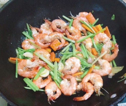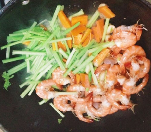 4、 把鲜虾铲到锅一边,加少许油,入芹菜、红萝卜,炒至半熟后同虾混匀翻炒片刻。