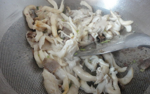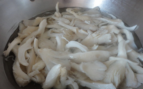 4、下入洗净掰成条的蘑菇,焯一下蘑菇,然后捞出蘑菇用凉水冲一下,攥去水分备用。