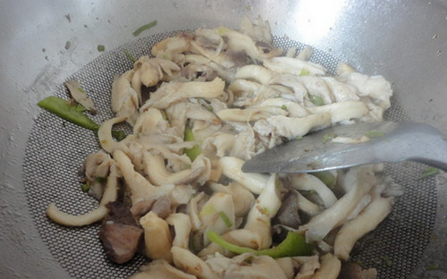 9、加一点水,尖椒下入,加盐炖一下蘑菇。