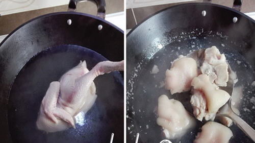 2、起锅烧开水,放入三黄鸡焯烫一下,捞出待用