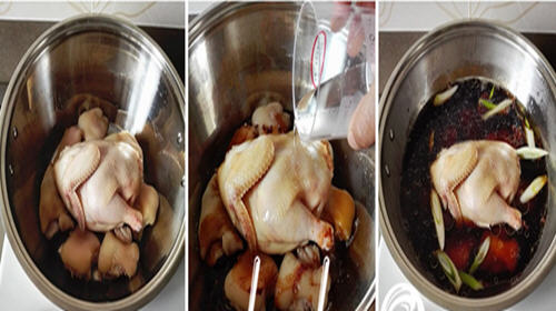 4、先把猪蹄放入自动锅中,上面放半只三黄鸡