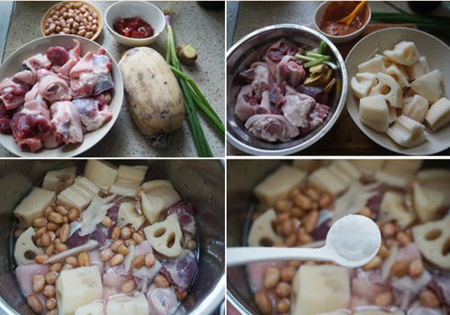 2,猪手冲洗干净血水,拔去黑色的皮毛,莲藕去皮后切成大块,姜葱切片切段,南乳用勺子压成无颗粒泥状;