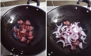 5、炒锅放少许的油,放入腊肉小火煸炒至出油;放入洋葱煸炒;