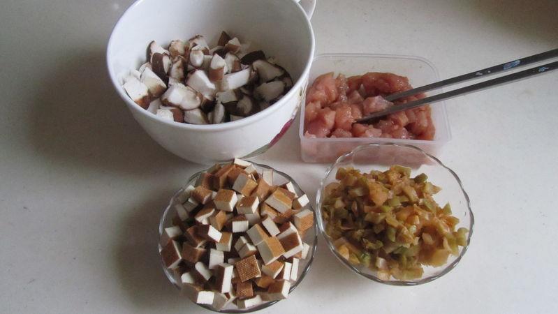 3. 将肉丁, 香菇丁, 香干丁, 榨菜丁等三鲜馅准备好;