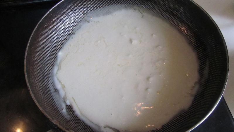 11. 再将锅烧热, 放入适量的油, 倒入面粉糊后转动一个锅, 使得面粉更加均匀;