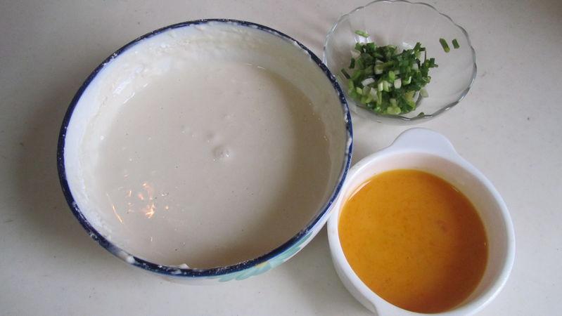 10. 准备好面糊, 打好一个鸡蛋, 切好香葱末;