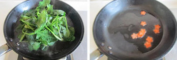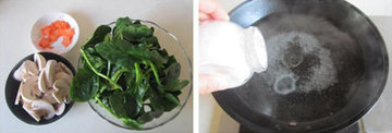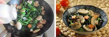 3、口蘑炒至八、九成熟时放入菠菜,翻炒两下加入盐调味即可。