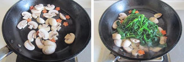 6、翻炒至口蘑八成熟时加入焯烫锅的菠菜进去翻炒;
