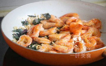 5.加入紫苏翻炒片刻,倒入虾,加椒盐快速翻炒均匀即可。