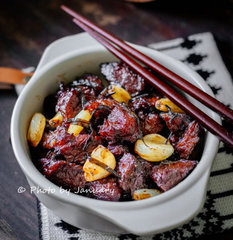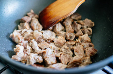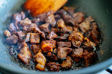 7、把牛肉块倒入刚刚炸过蒜的油里面翻炒;
