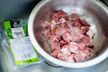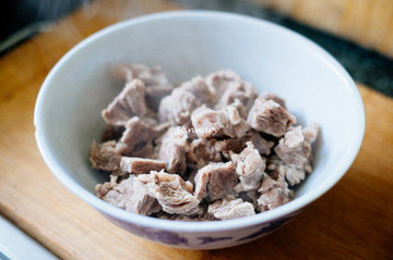 4、牛肉块冷水下锅,加入姜片焯水,捞出牛肉块;