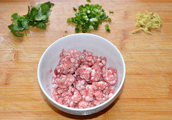 2、准备好猪肉末,香菜碎,姜末和香葱碎。