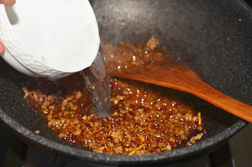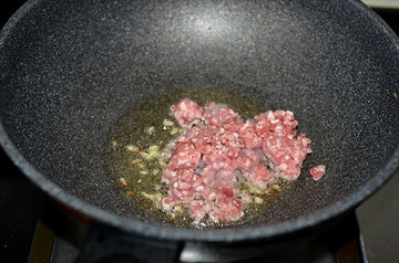 3、炒锅中倒油,先放入姜末炒香后加入猪肉末翻炒。