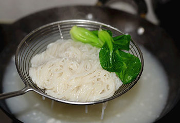 9、另起一锅,水开后将米粉煮熟顺便烫几颗青菜芯。