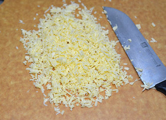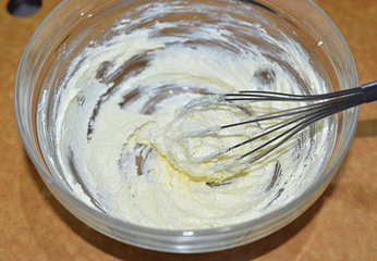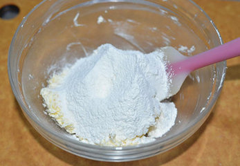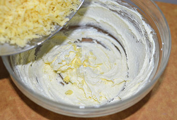 5、加入切好的奶酪粒,用刮刀翻拌均匀。