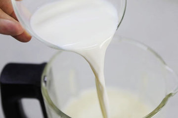 4、豆浆做好以后,打开杯盖,倒入牛奶,搅匀即可。喜欢香甜口味的同学可以放入糖搅拌至糖融化,当然不放糖也是OK的。