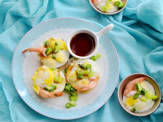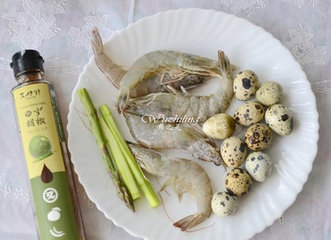 1、准备大虾、鹌鹑蛋和芦笋少许,浇汁你可以用蒸鱼豉油或者和我一样用日式调味汁就好。为何加入芦笋,因为这个可是抗癌之王,多吃对身体有益,同时也均衡全面了这道菜的营养。