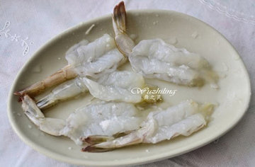 2、将大虾留尾壳,然后背部划开去肠线洗净,用盐腌制几分钟。
