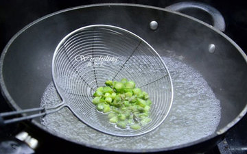 6、然后利用热水滴几滴橄榄油,放入芦笋丁焯烫下捞起。
