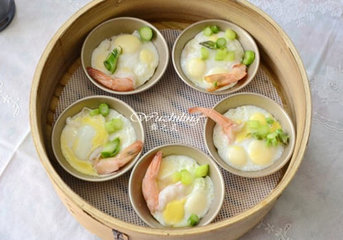 7、码在蒸好的虾扯蛋上,然后浇上调味汁即楞,清清爽爽的一道美食就做好了,非常适合一家人分享,补肾壮阳还美容作用。