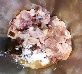 1、鸡肉斩成2厘米见方的小块,加入腌肉料抓匀腌制30分钟,让鸡肉有点底味。