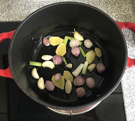 3、珐琅锅或者砂锅烧至轻微冒烟,倒油,大约能布满锅底,下葱姜蒜炒至大蒜变黄,香味飘出。
