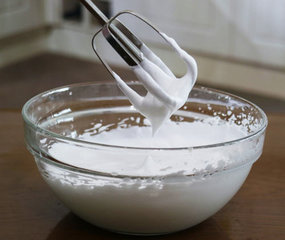 5. 大碗中放入牛奶,淡奶油,细砂糖和海盐,用打蛋器的一个头打至5-6分发,浓稠有纹路的状态即可。