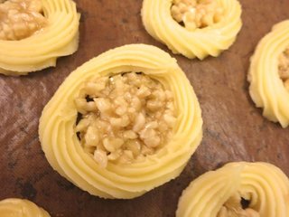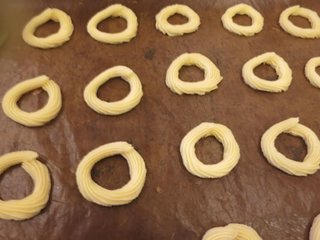 烤盘铺上烤培布或烘培纸。将面糊装入挤花袋中,用约0.8cn星形挤花嘴挤出约4.5~5cm直径的圆圈