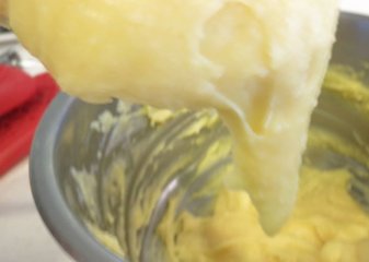 待面糊稍降温后(约3~5min,不要在面糊高温时倒入蛋液,会产生凝结硬化),逐次少量加入打散蛋液,每次搅拌均匀后才可再加入蛋液,直至面糊呈现倒三角形缓慢滴落程度即不需再加入蛋液(蛋液请斟酌)