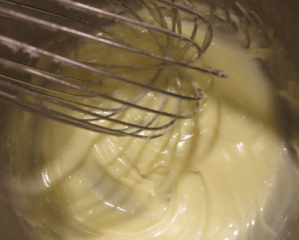 奶油乳酪与细砂糖隔水加热并持续用打蛋器搅拌至无颗粒状