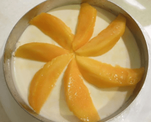 芒果冻作法:将芒果切成薄片状,平铺在起士蛋糕上
