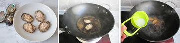 6、锅中加入1大勺蚝油、少许料酒,和少许水,您也可以加一点糖,加入鲍鱼一起煮开,蚝油不要一下子放太多,您可以尝一下汤汁的味道来决定用量。