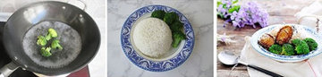 8、把米饭装入碗中压实倒扣,再配上焯好的西兰花。