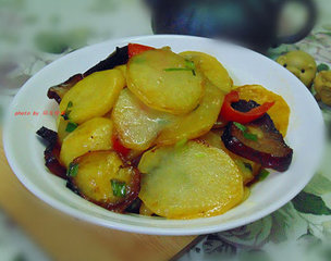 6、腊肉回锅兜炒,最后放入红辣椒和葱,炒匀后出锅。