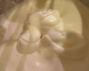 再将蛋液用电动搅拌器打至舀起蛋液有明显痕迹且不易消失