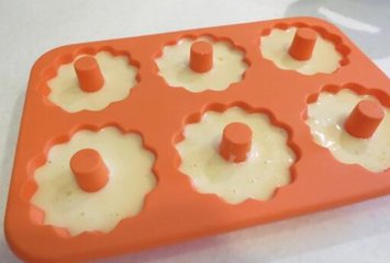 再倒入矽胶模具中9分满即可,放入预热180度烤箱烤15~18min,用竹签刺入无粘黏即可,取出稍降温再脱模放凉