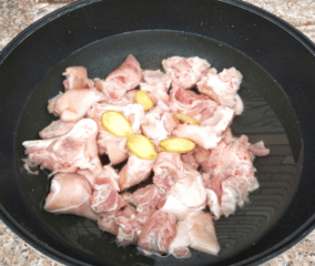 1.把斩成小块的猪蹄冷水下锅,加入姜片,料酒,大火烧开,煮个几分钟,期间撇去浮沫,捞出来放入凉水中浸泡几分钟,沥水备用。