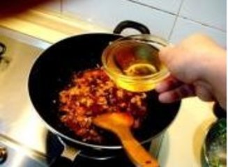 6.肉末变色后下入豆瓣酱煸炒,煸炒出香味后下入豆豉煸炒。