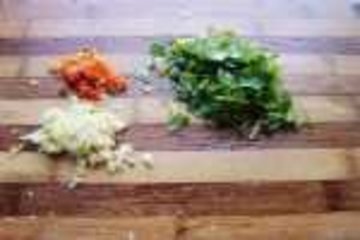 4、香菜洗净切小段,小米辣和蒜用刀切碎。