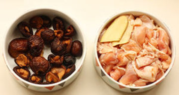 1.鸡腿去骨后切成块,用生抽,糖,油,姜蓉腌制。香菇泡软洗干净杂质。